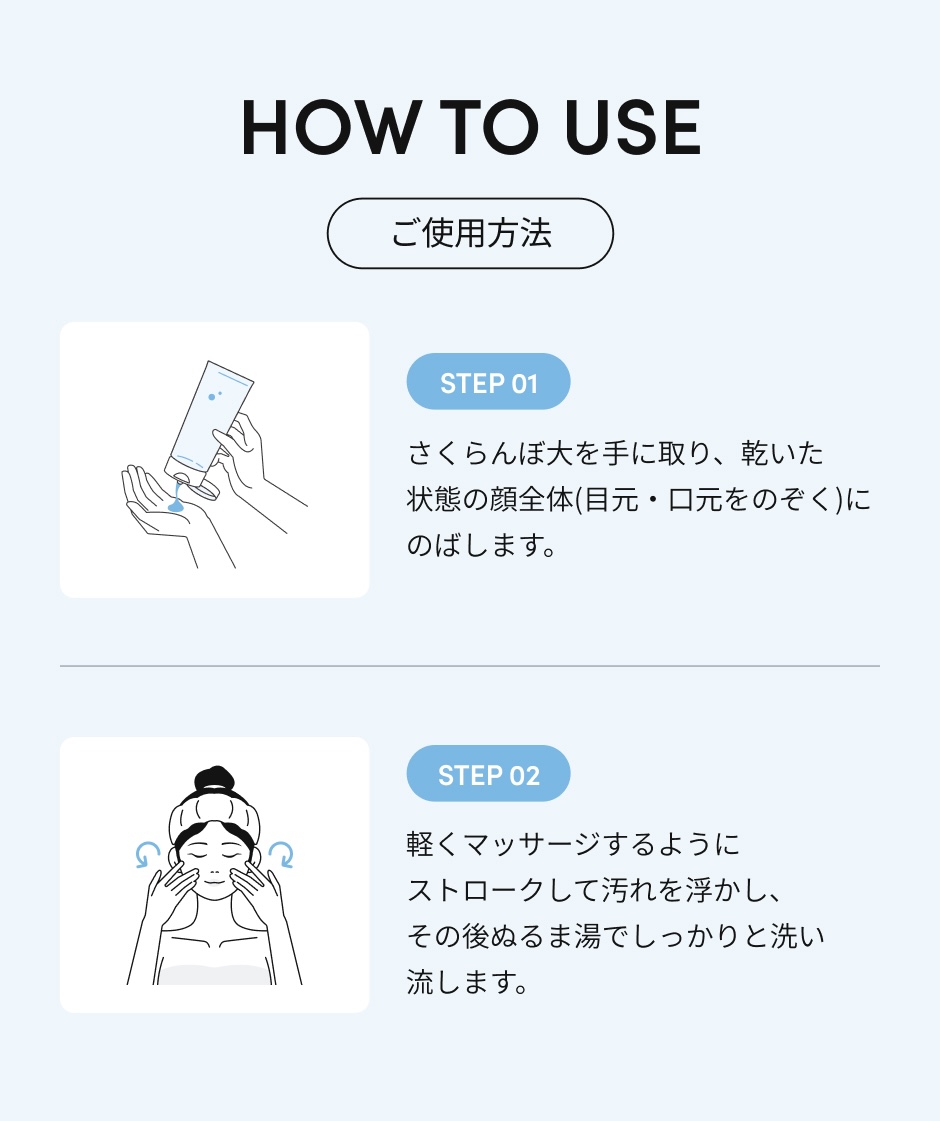さくらんぼ大を手に取り、乾いた状態の顔全体(目元・口元をのぞく)にのばし、軽くマッサージするようにストロークして汚れを浮かし、その後ぬるま湯でしっかりと洗い流します。