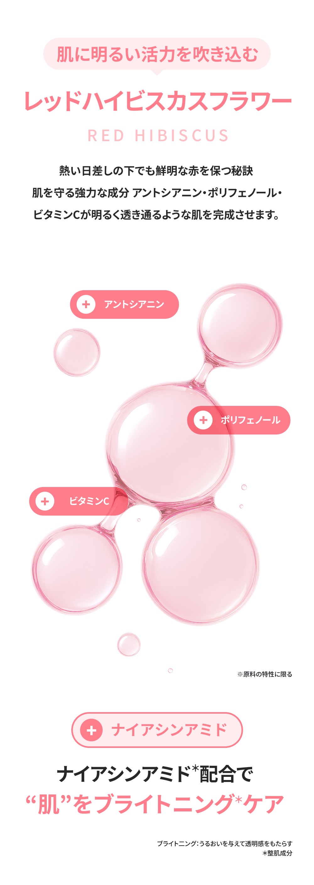 水、DPG、(カプリル酸/カプリン酸) PEG-6グリセリズ、グリセリン、カプリン酸ポリグリセリル-4、ナイアシンアミド、カプリル酸ポリグリセリル-6、ハイビスカス花エキス、クチナシ果実エキス、グルタチオン、1,2-ヘキサンジオール、トロメタミン、ヒドロキシアセトフェノン、カフェイン、尿素、コーンスターチ、エチルヘキシルグリセリン、オウレン根エキス、EDTA-2Na、BG、カルボマー、デキストリン、カプリロイルサリチル酸、グルコノラクトン、酸化鉄、ヒドロキシプロピルメチルセルロース、加水分解野菜タンパク、マルトデキストリン、ミネラル塩、香料