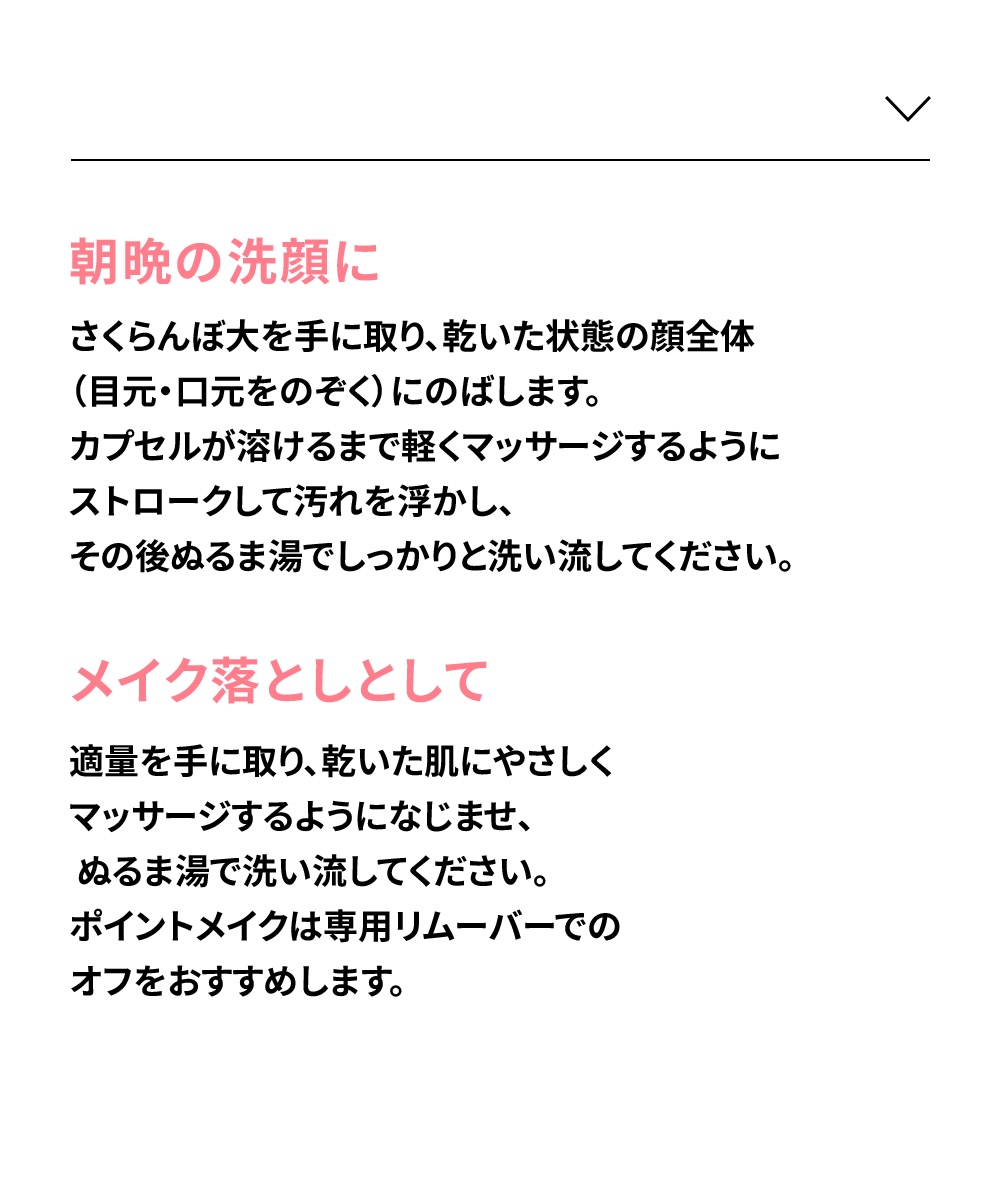 さくらんぼ大を手に取り、乾いた状態の顔全体(目元・口元をのぞく)にのばし、カプセルが溶けるまで軽くマッサージするようにストロークして汚れを浮かし、その後ぬるま湯でしっかりと洗い流してください。ポイントメイクは専用リムーバーでのオフをおすすめします。