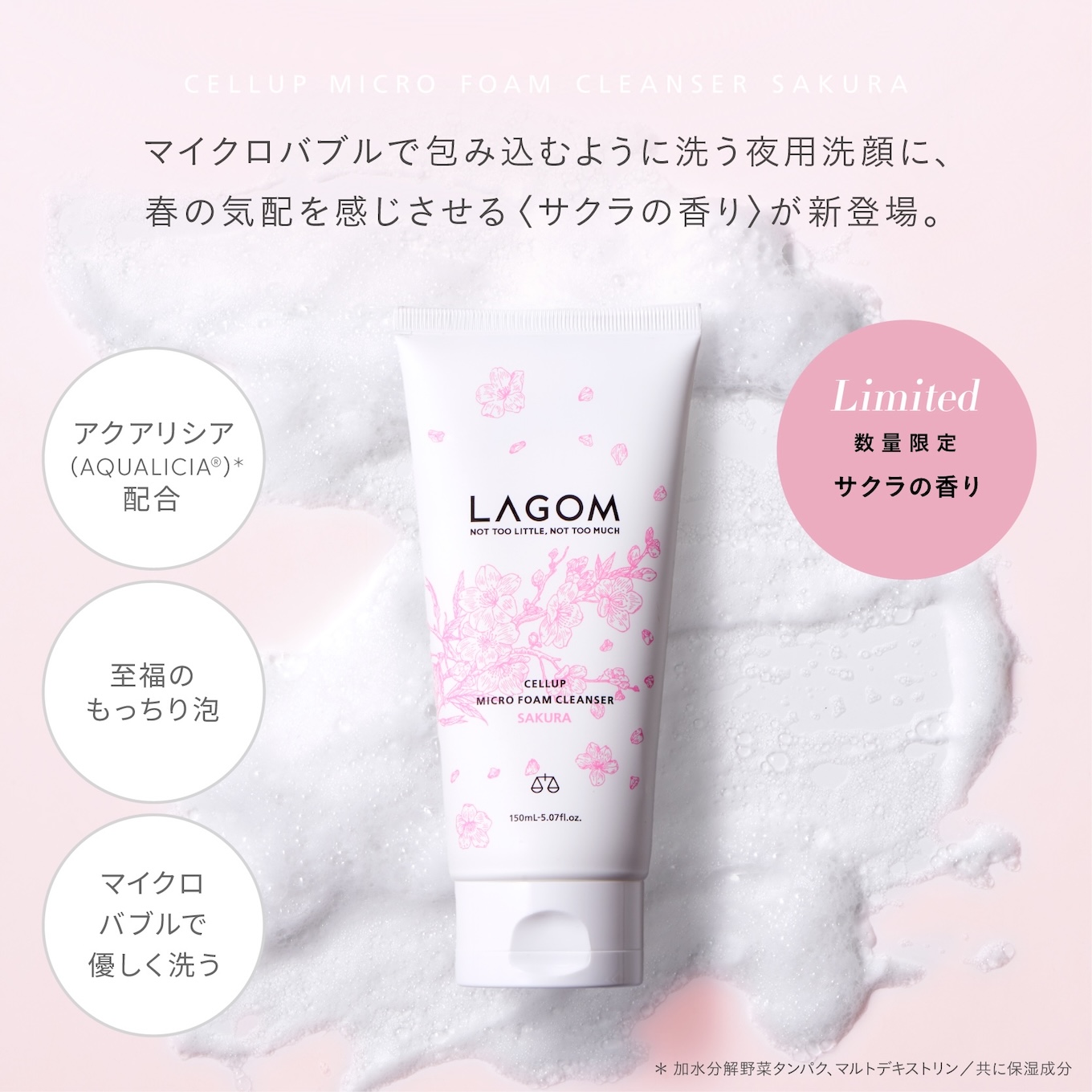 たっぷりのマイクロバブルで包み込むように洗うクレンジングフォームから、春の気配を感じさせるサクラの香りが数量限定で新登場。まるで生クリームのような、もっちりとしたきめの細かい泡で洗う至福の夜用洗顔料です。メイク汚れはもちろん毛穴汚れや老廃物までキレイに絡めとって洗い上げます。肌*1の水分保持力に着目した成分「アクアリシア(AQUALICIA®)*2」配合で、洗い上がりの肌もしっとり。W洗顔は不要です。